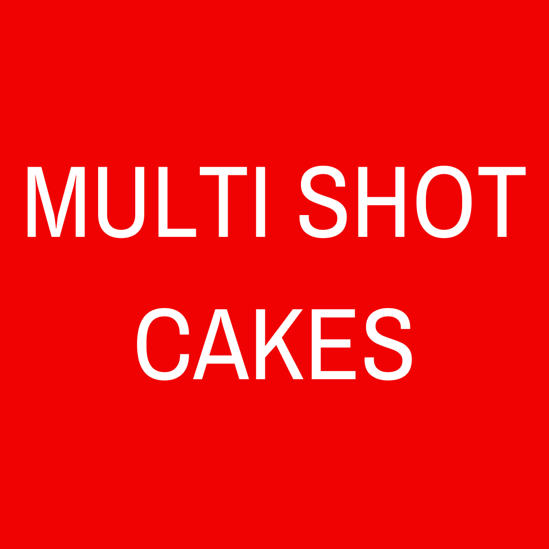 MULTI SHOT CAKESMulti shot cakes and barrages are the most popular fireworks, they are also known as cakes or batteries. They consist of a number of shots that are normally fired into the air from a single box that sits on the ground, with different colours and effects, by one single ignition. Barrages comes in a number of sizes from 10 to 140 shots.